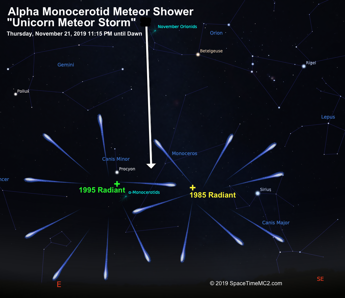 The Alpha Monocerotids are so named because the meteors seem to radiate from the constellation Monoceros. In other words, you can see these meteors in any part of the sky, but they appear to be coming directly from the area where the Monoceros constellation is in the south to southeastern sky. Monoceros is a bit southwest from Orion.