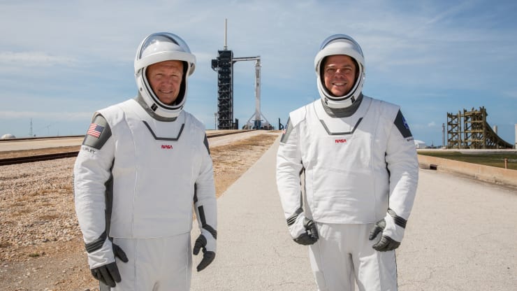NASA astronauts Douglas Hurley (L) and Robert Behnken pose while participating in a dress rehearsal for launch at the agency’s Kennedy Space Center ahead of NASA’s SpaceX Demo-2 mission to the International Space Station. Liftoff is Wednesday, May 27th at 4:33 PM Eastern Time from Launch Complex 39A at Kennedy Space Center in Florida.